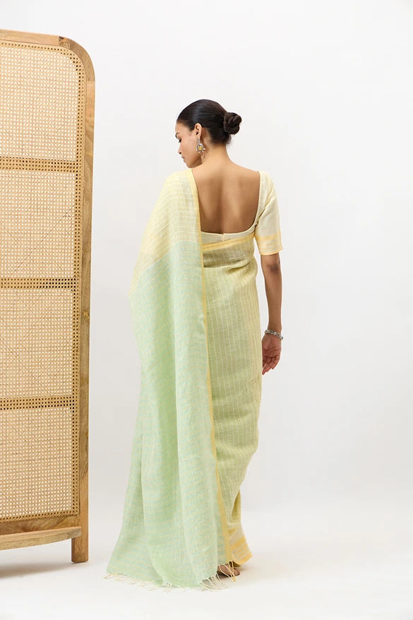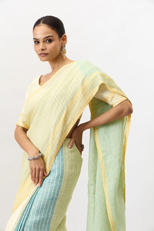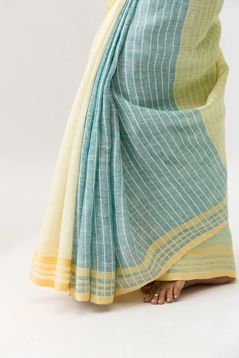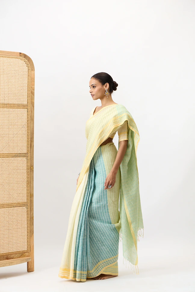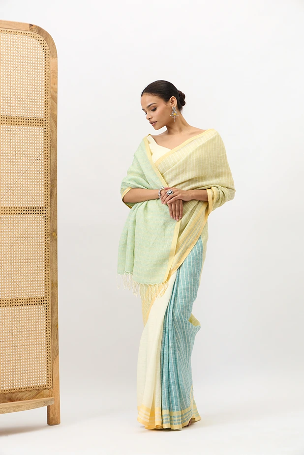 This Bonolata is a handloom pure linen saree with multicolour stripes blend of the green family. The crisp texture of linen, with vibrant eye catching lines offeres a modern yet traditional appeal. Ideal for summer gatherings, festive brunches, or cultural events.