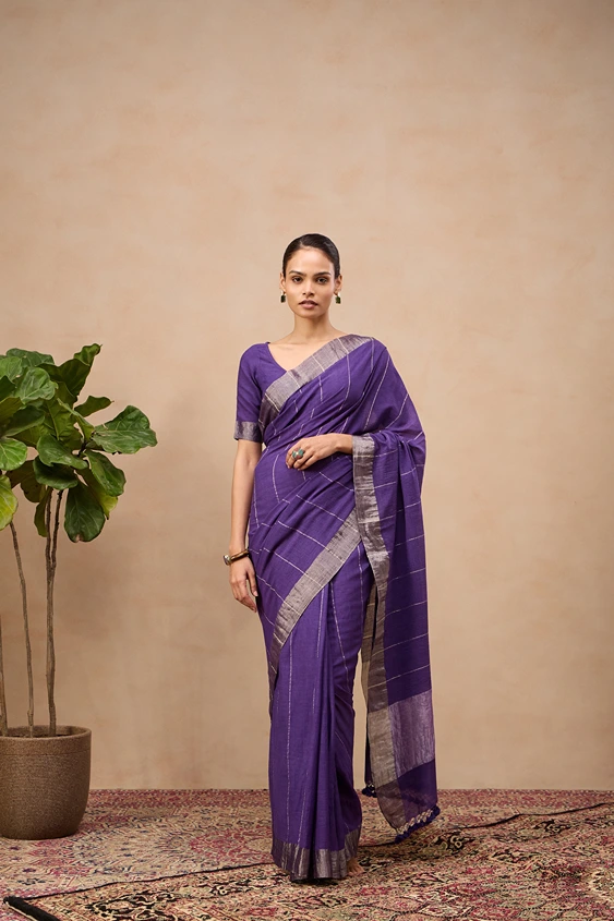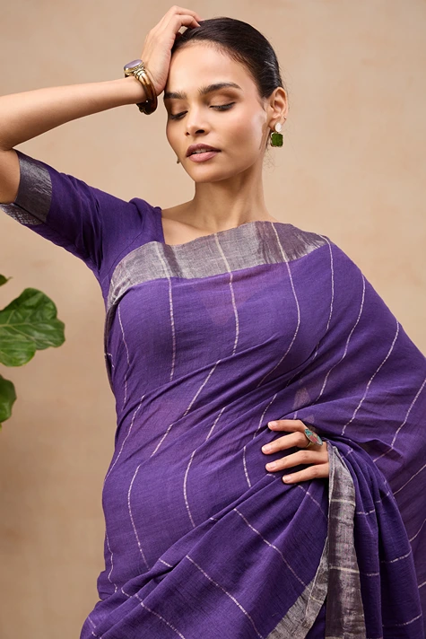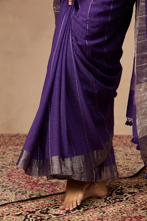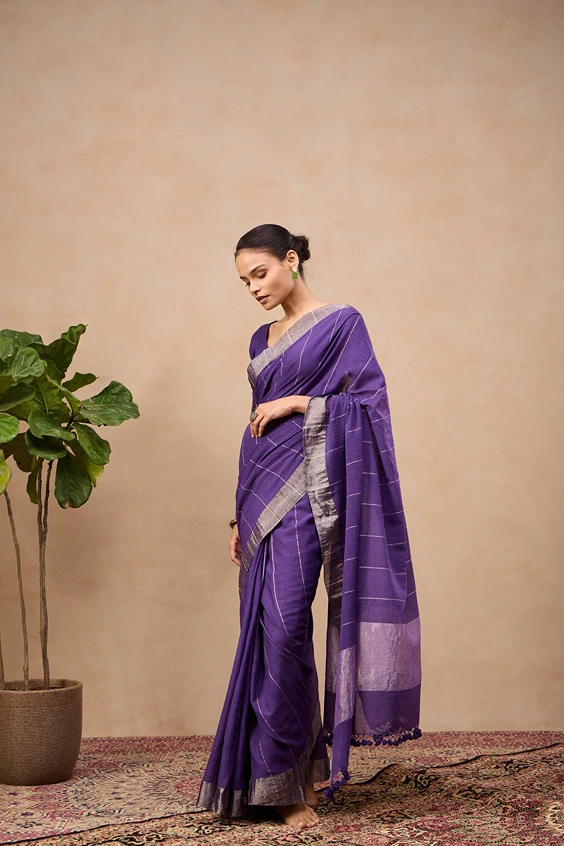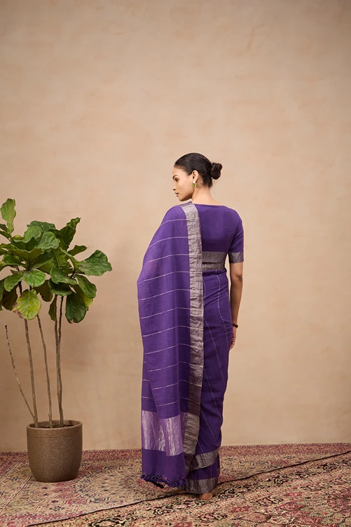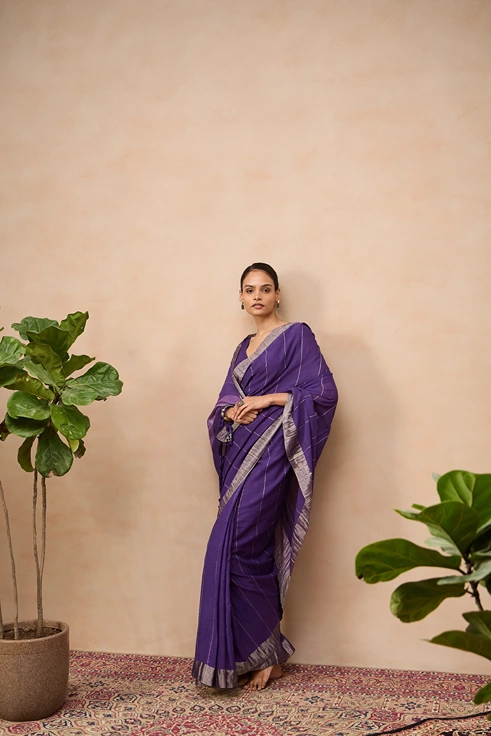 This purple graha lata saree features a handwoven cotton saree with zari stripes throughout. The rich texture of cotton paired with metallic sheen makes it perfect for evening functions, festive celebrations, or traditional ceremonies where understated luxury meets comfort.