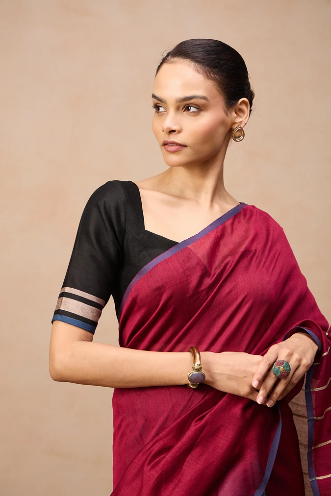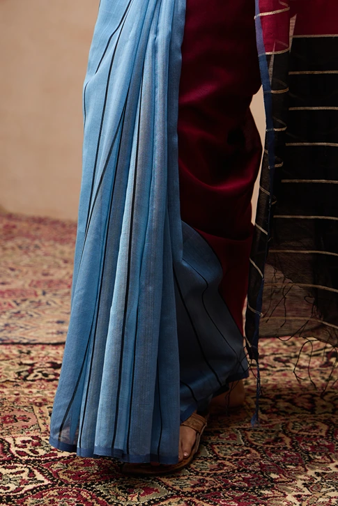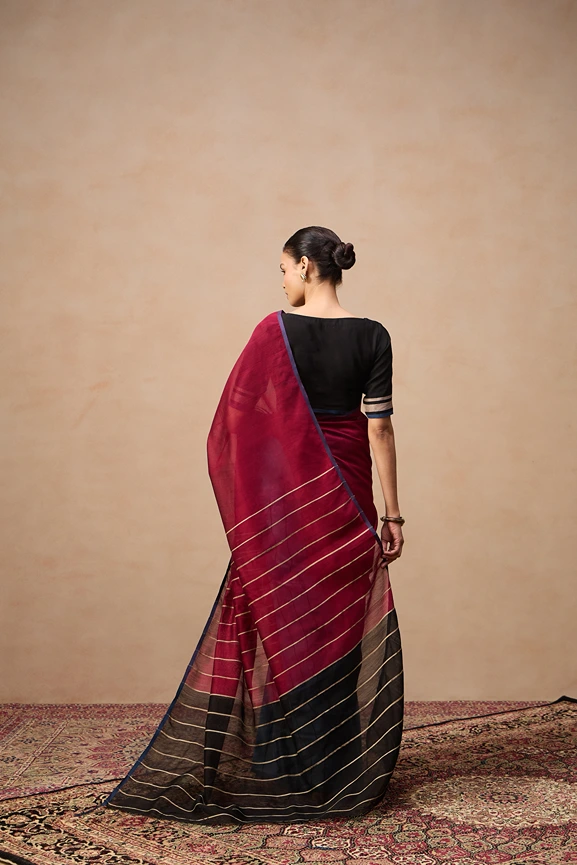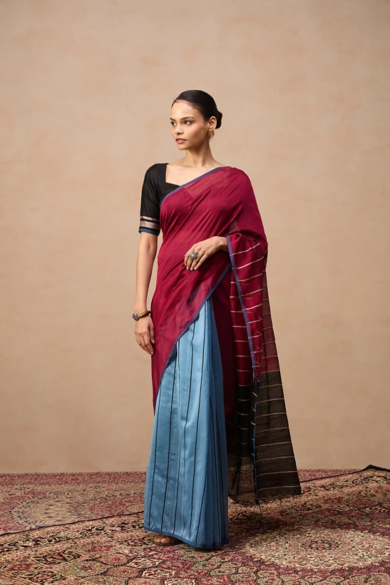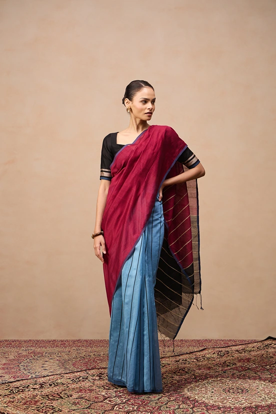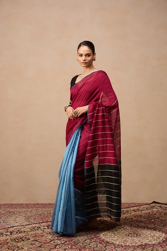 Indu rekha is a handloom cotton silk saree featuring a striking play of contrasting shades, lending it a bold and artistic appeal. The body is adorned with fine linear lines that adds a sense of rhythm, while the pallu is enriched with textured gheecha lines, bringing a raw organic elegance. It is an ideal choice for standing out at any function or occasion.