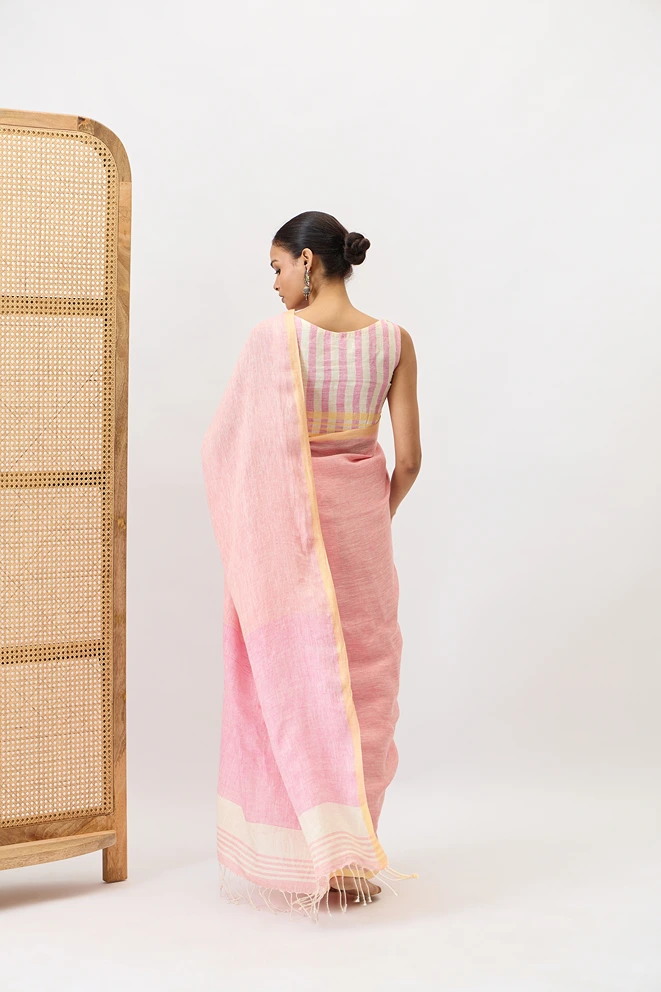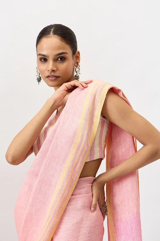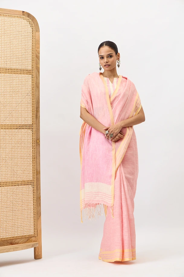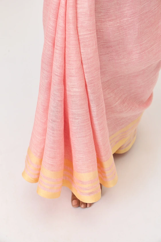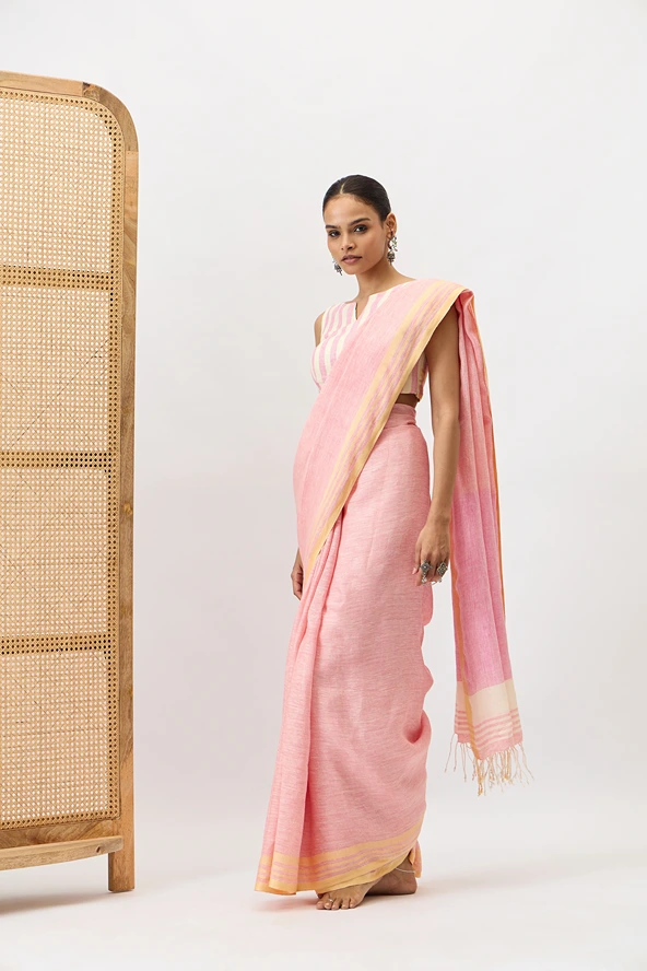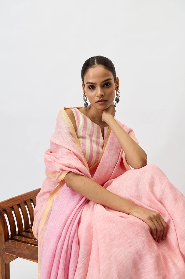 Kumudini is a handwooven linen saree that exudes understated elegance and refined craftsmanship. The subtle body contrasts beautifully with the stipped pallu and the elegant border, making it ideal for formal events, work settings or elegant daytime occasions.