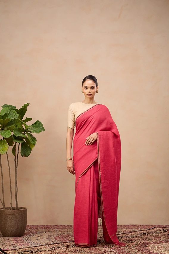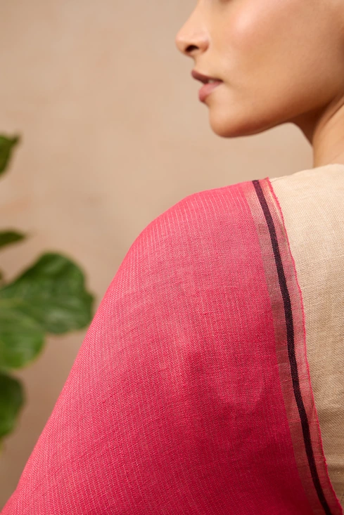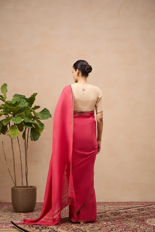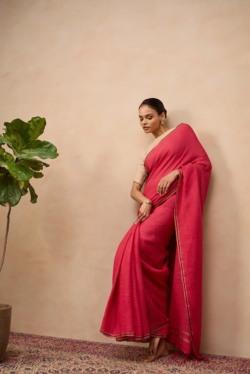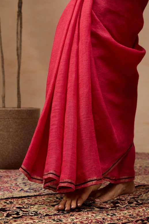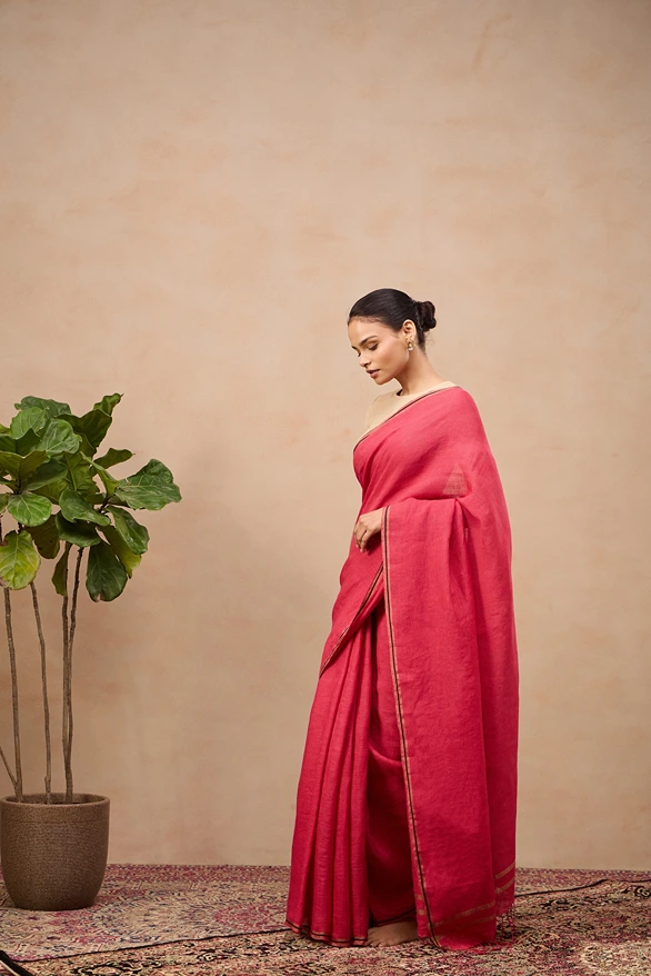 Nakshatra is a handwoven linen zari saree, that features pure zari threads woven delicately accross the entire body. The interplay of soft fabric and metallic glint offers understated luxury making it ideal for elegant day events, intimate festive gatherings or refined evening occasions.