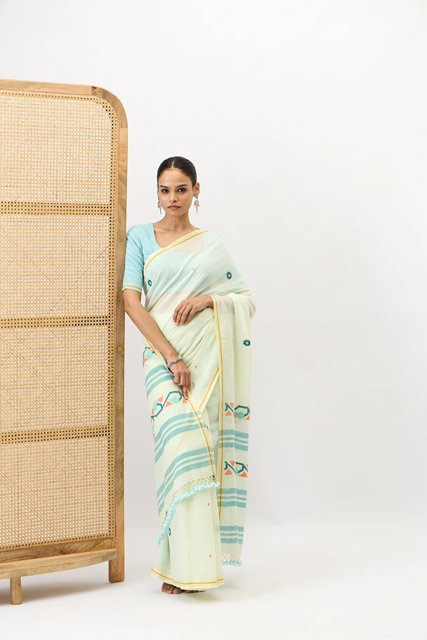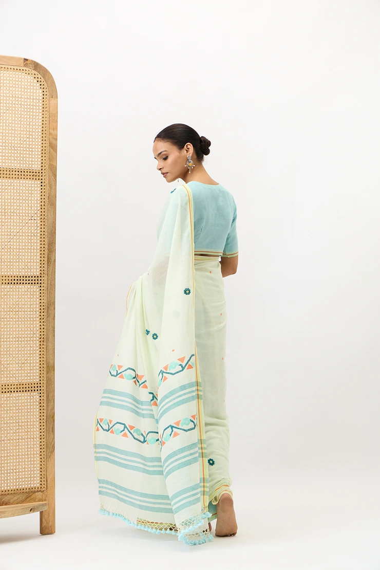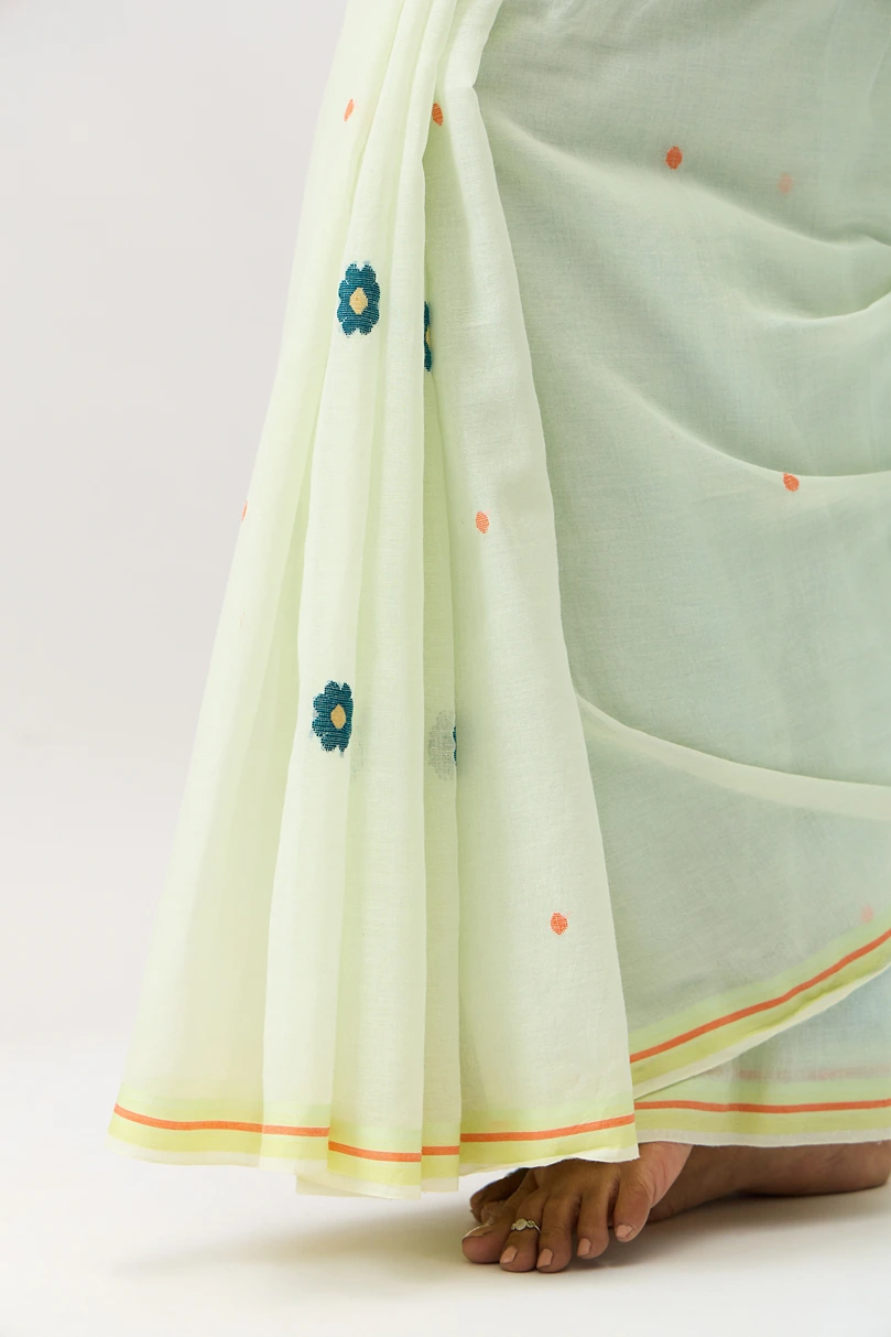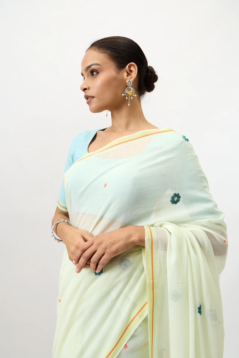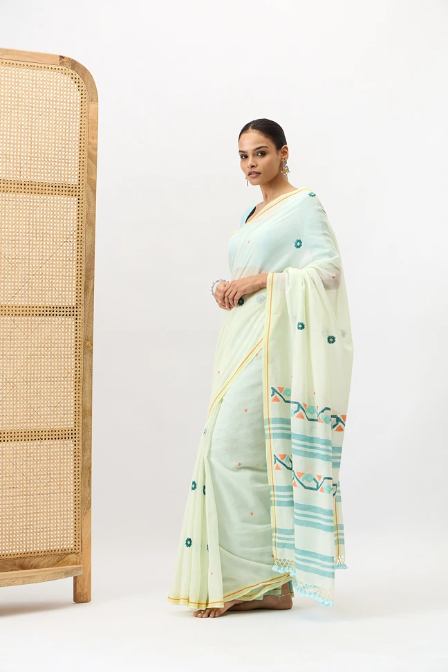 Phulbari is a handwoven cotton jamdani saree adorned with delicate floral motifs and a pallu featuring elegant jamdani floral vine. Ideal for festive occasions, pujas, or daytime celebrations, it offers graceful blend of comfort and cultural charm.