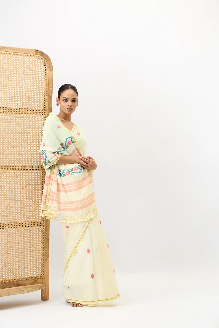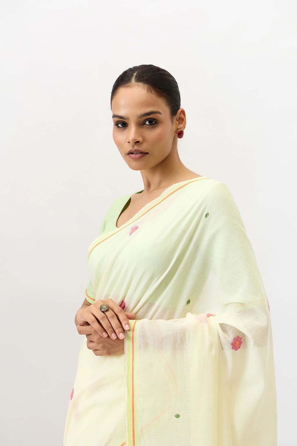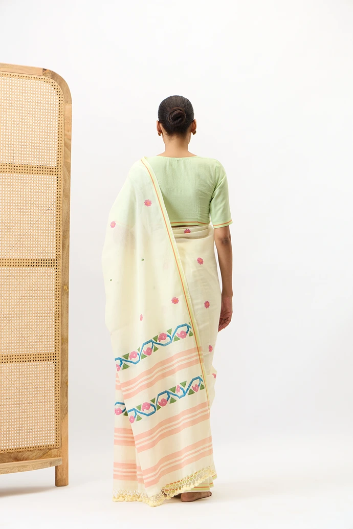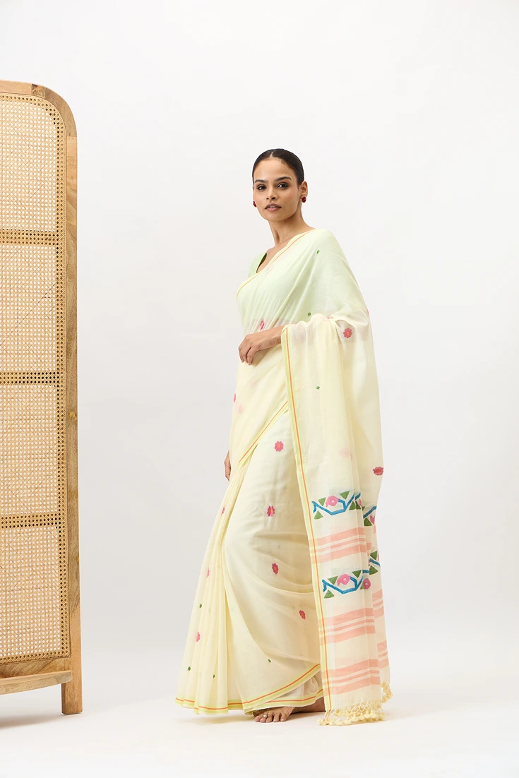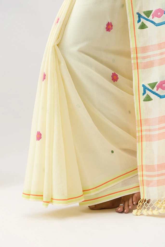 Phulbari is a handwoven cotton jamdani saree adorned with delicate floral motifs and a pallu featuring elegant jamdani floral vine. Ideal for festive occasions, pujas, or daytime celebrations, it offers graceful blend of comfort and cultural charm.