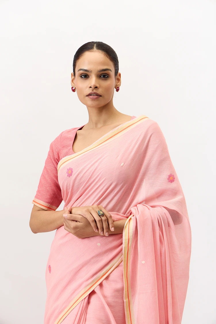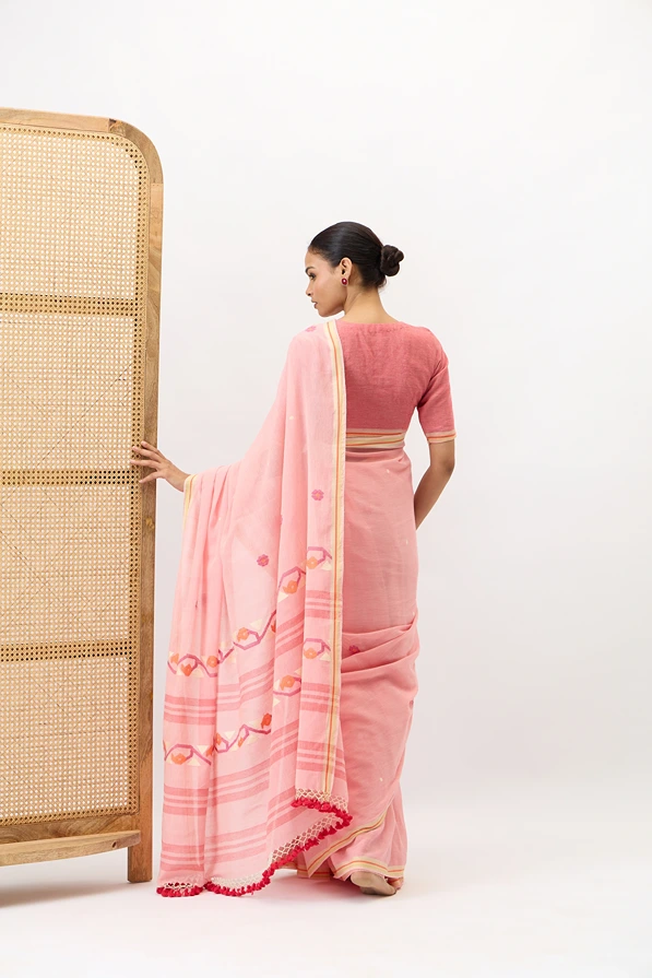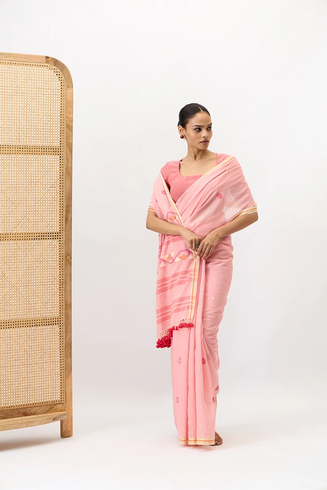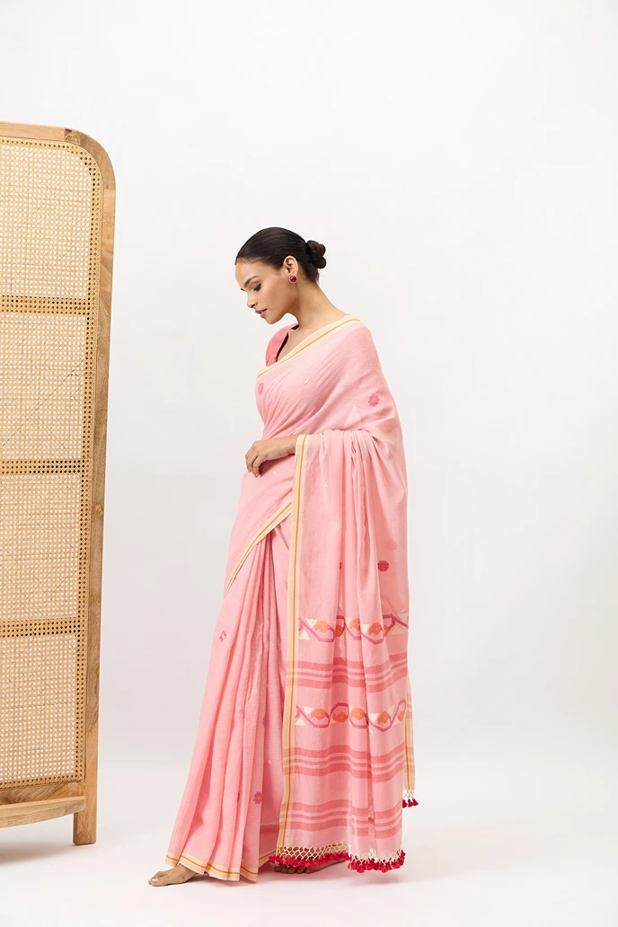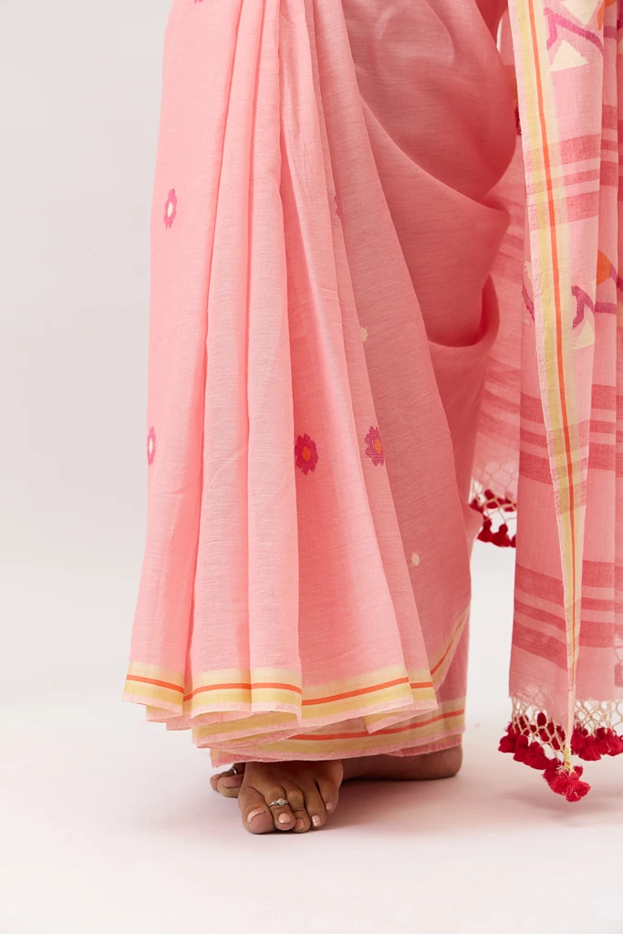 Phulbari is a handwoven cotton jamdani saree adorned with delicate floral motifs and a pallu featuring elegant jamdani floral vine. Ideal for festive occasions, pujas, or daytime celebrations, it offers graceful blend of comfort and cultural charm.