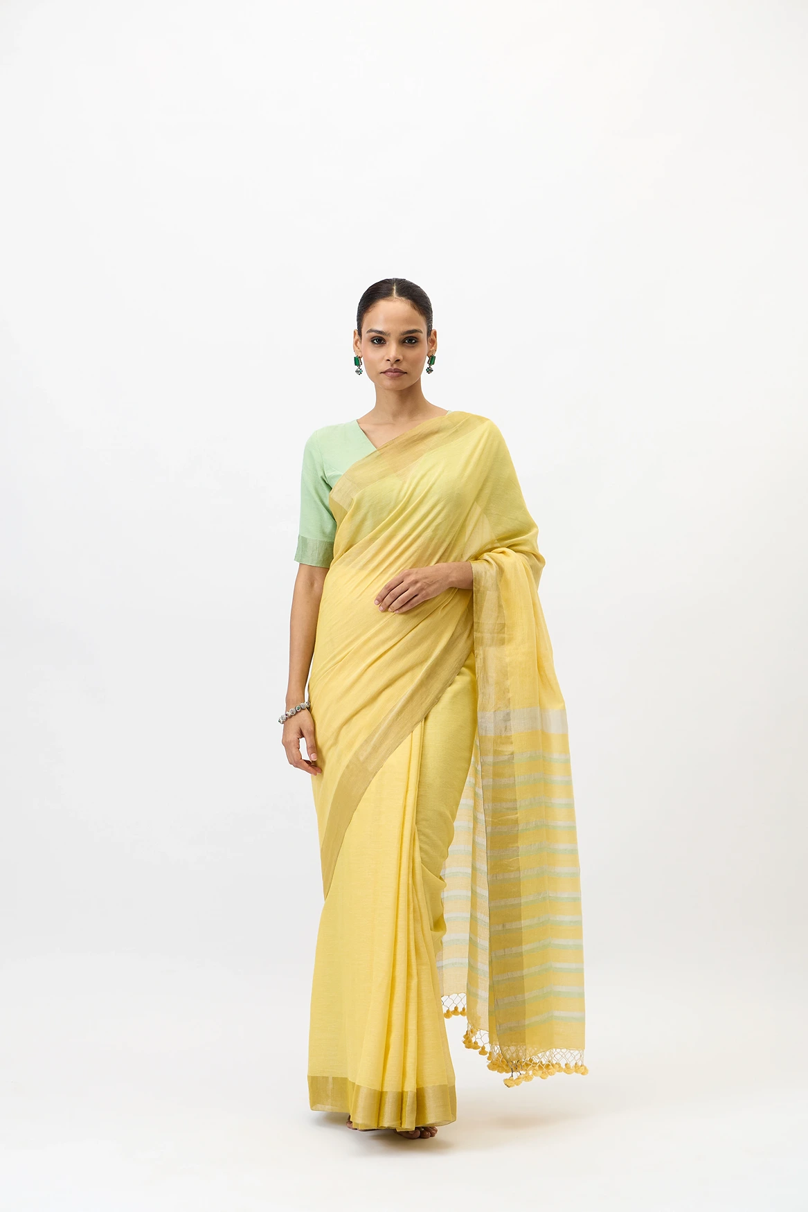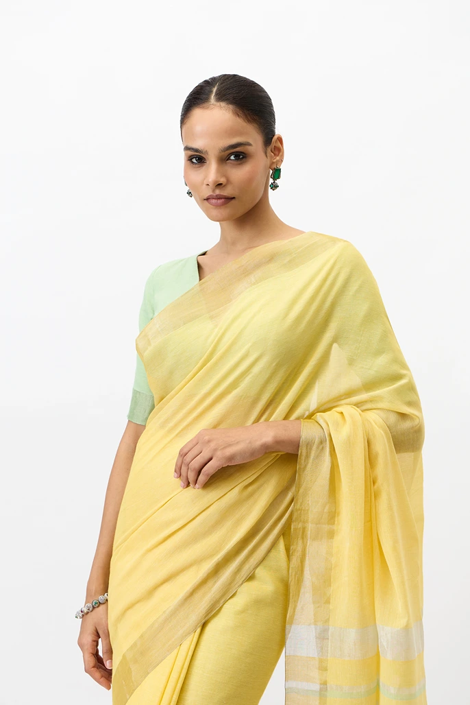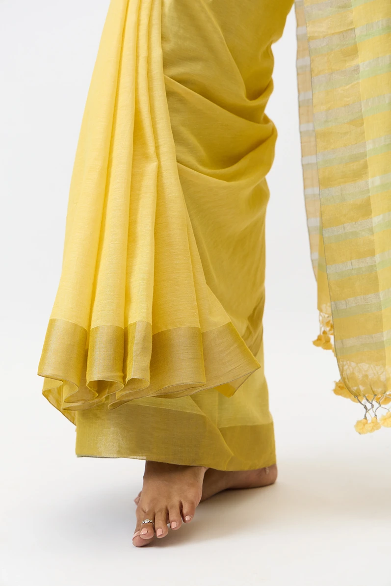 The pitambari saree is a fine handwooven cotton zari piece that features soft shade of celebratory yellow. The use of zari at the selvedge and the pallu makes it super elegant and fit for any day event.