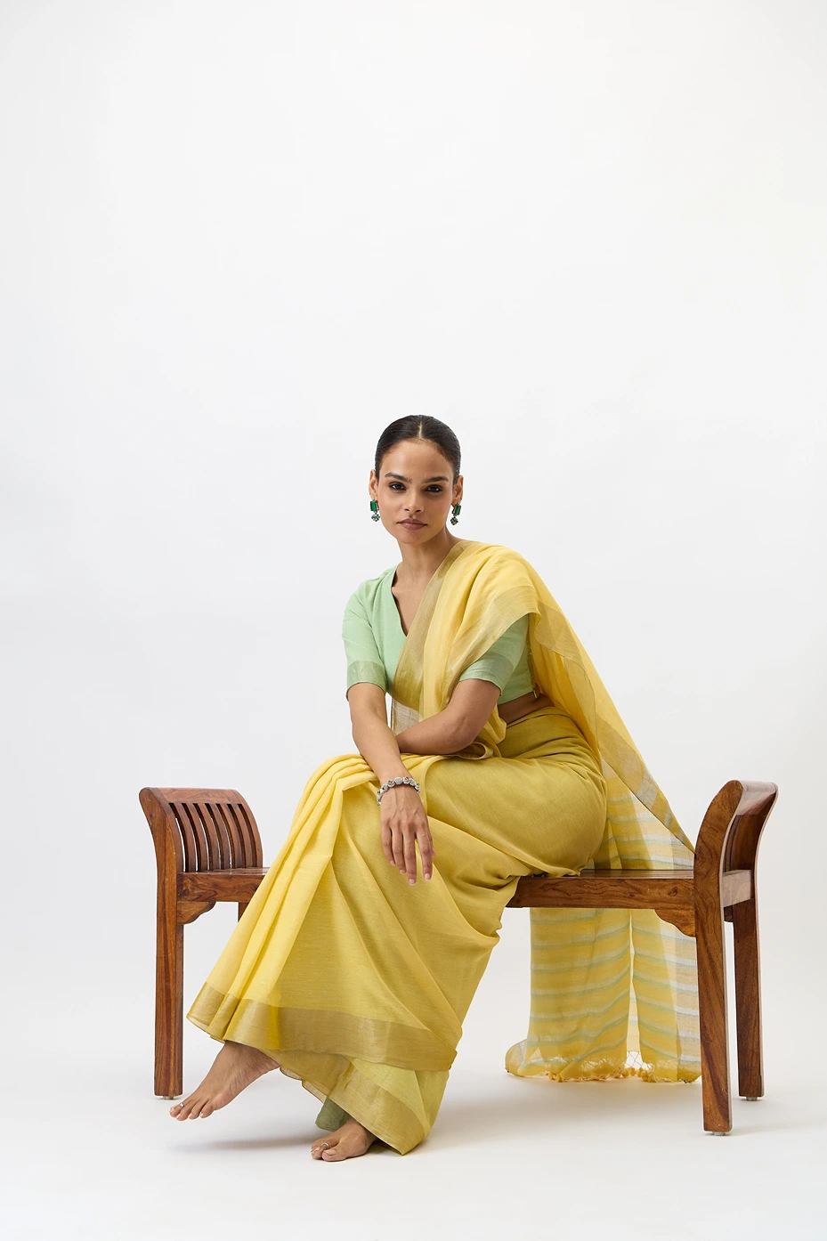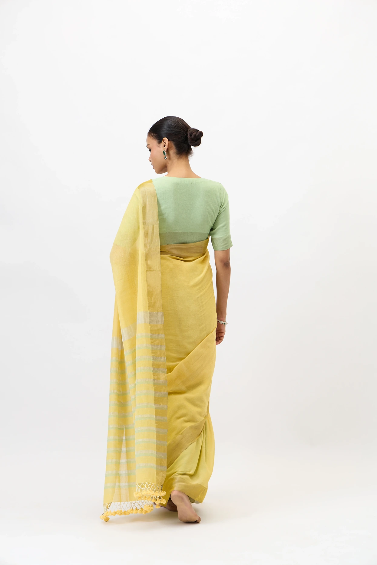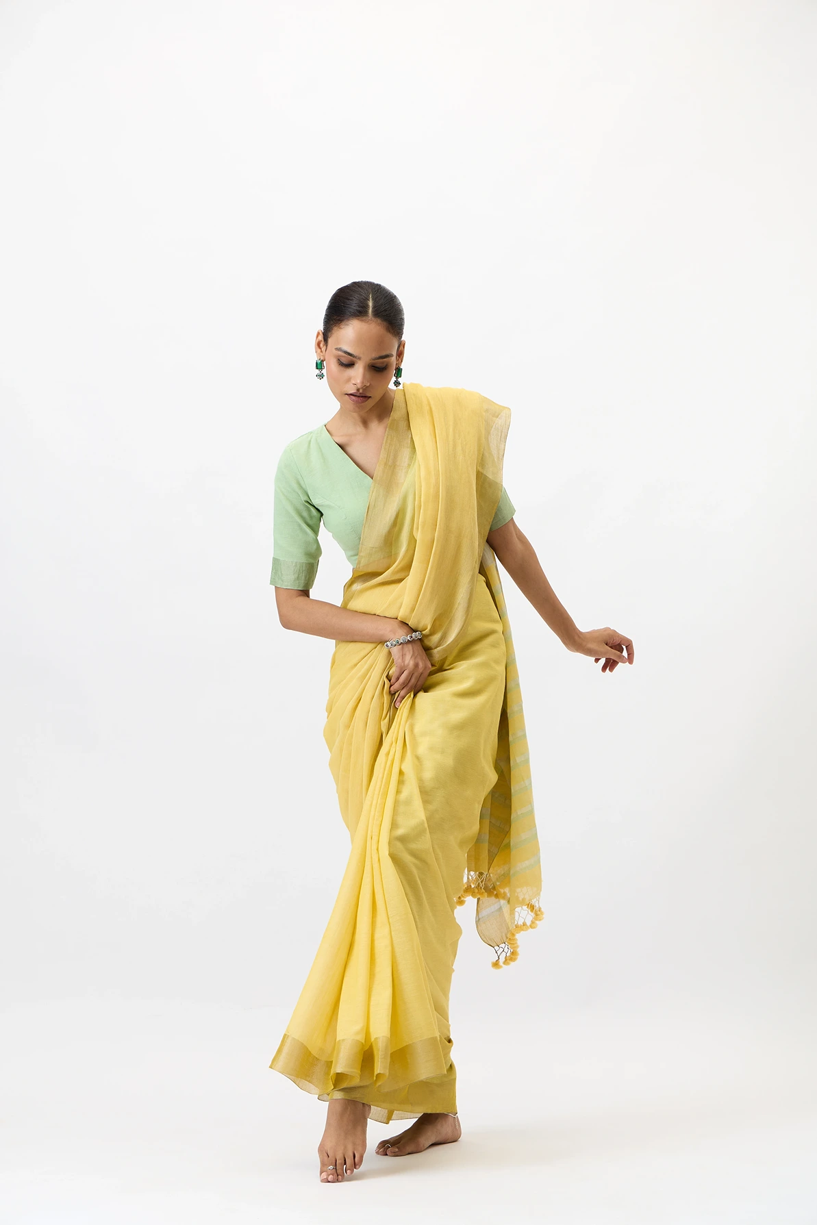 The pitambari saree is a fine handwooven cotton zari piece that features soft shade of celebratory yellow. The use of zari at the selvedge and the pallu makes it super elegant and fit for any day event.