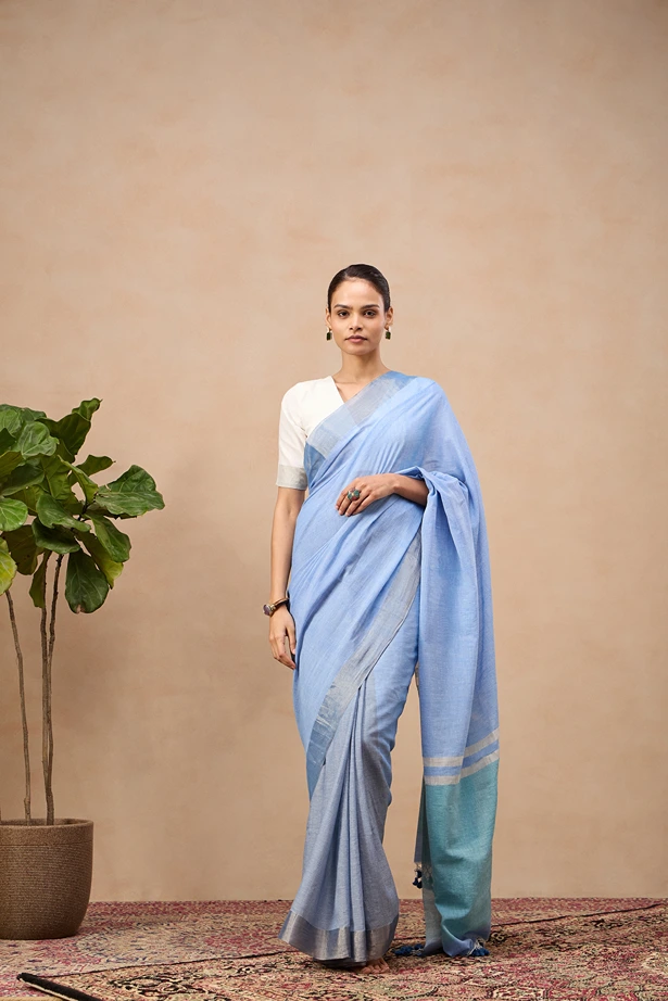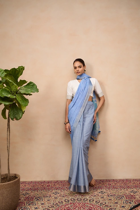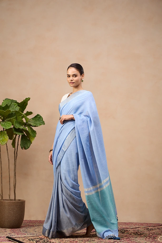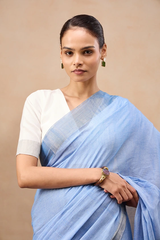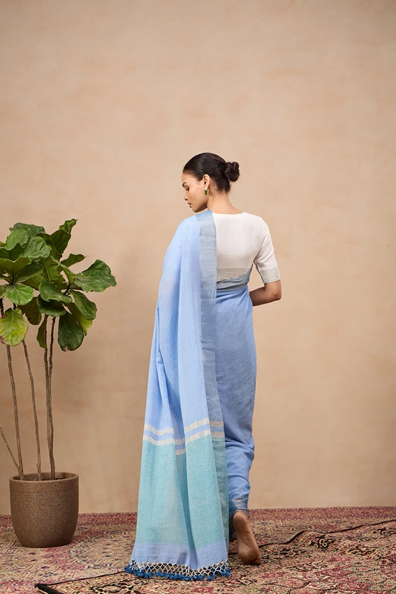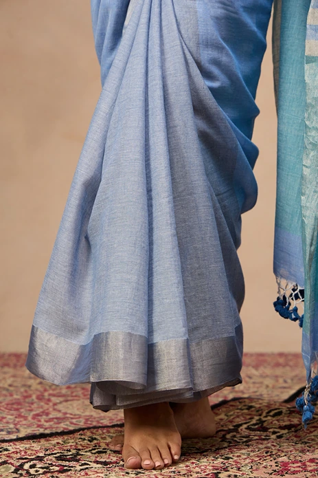 This sangam saree is a fine handwoonen cotton zari piece. It's a blend of two beautiful shades of blue with a defining silver zari border. The deeper shade of pallu with broad zari stripes adds a lovely playfulness to this attire.
