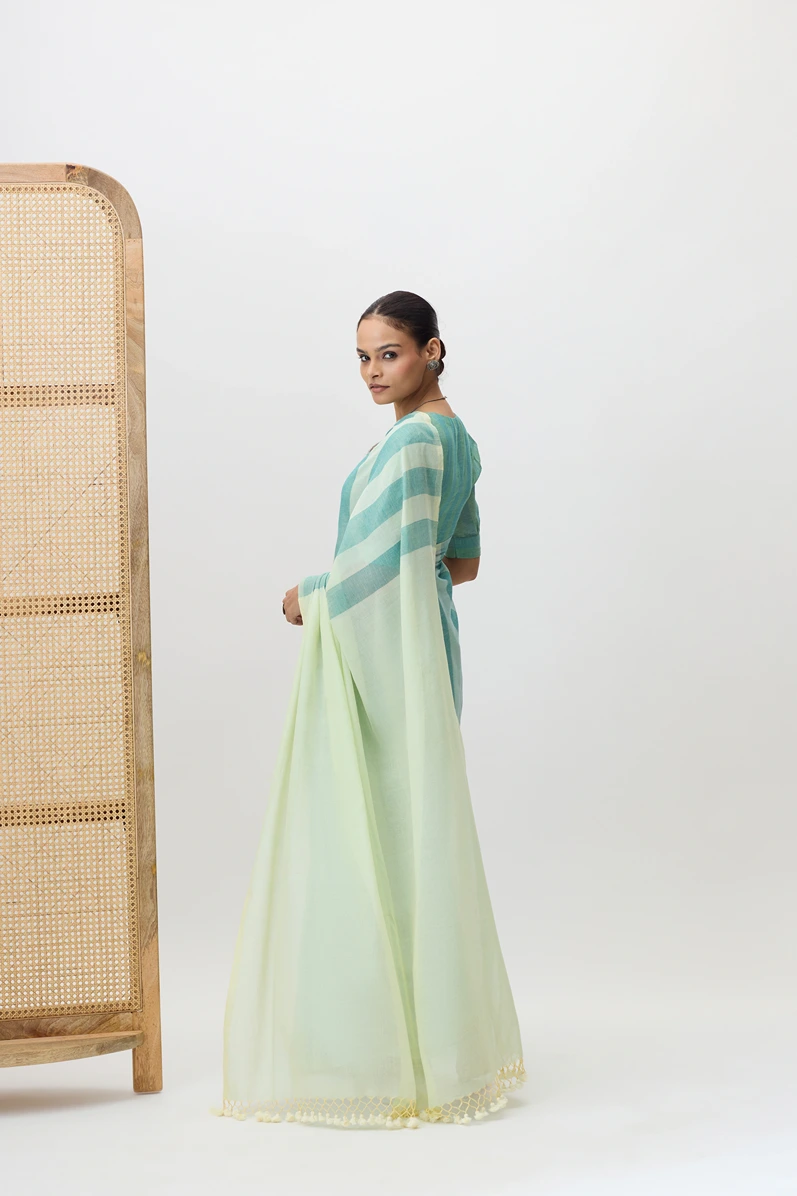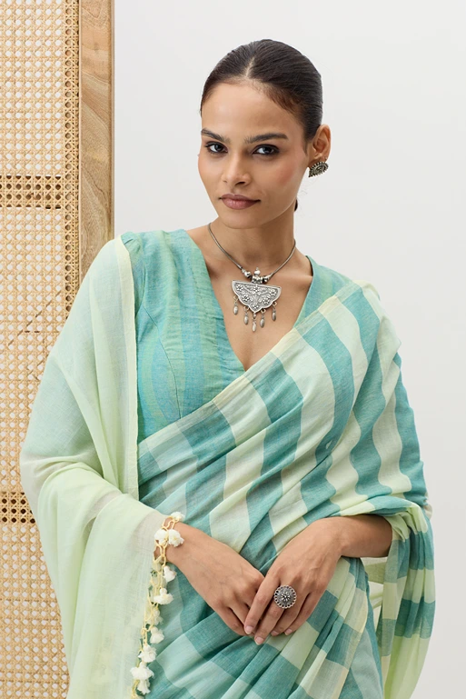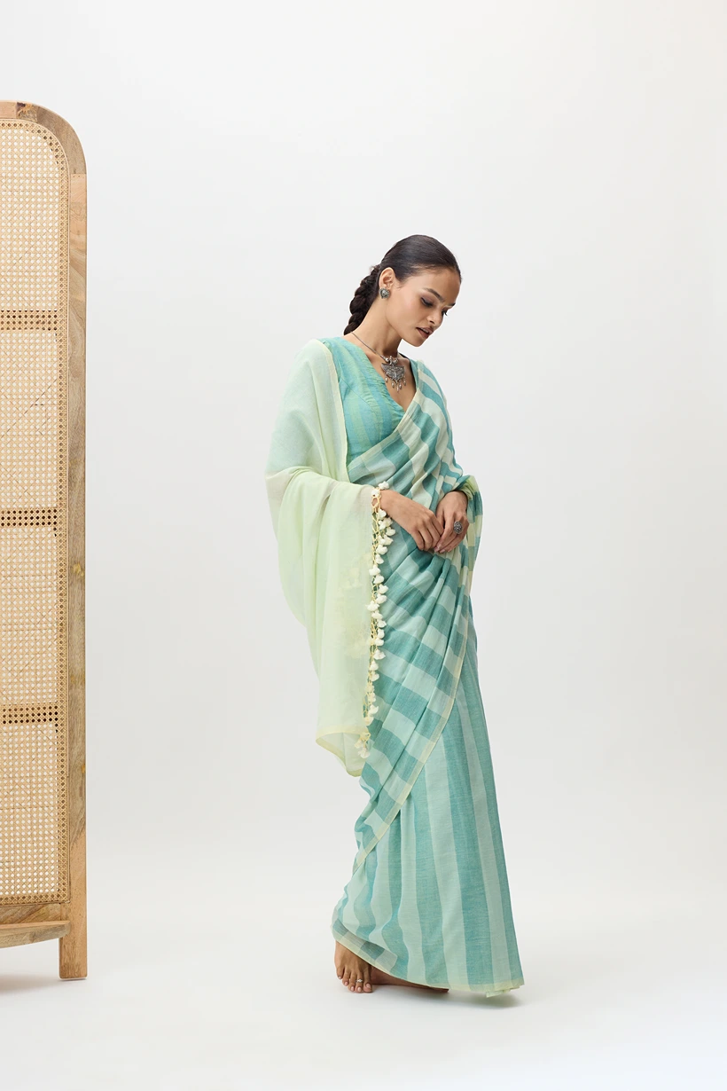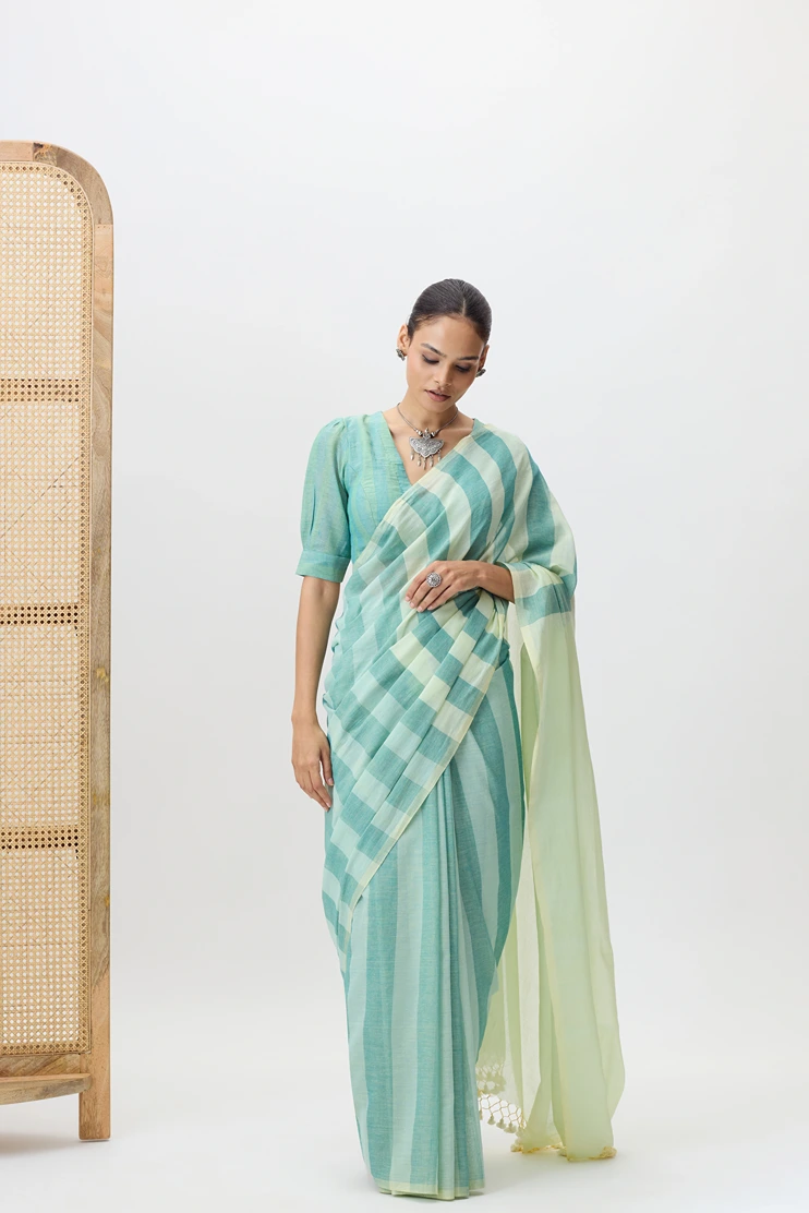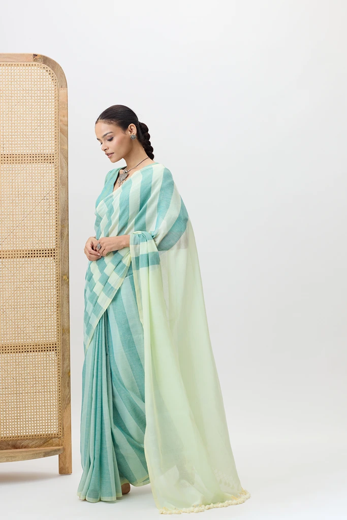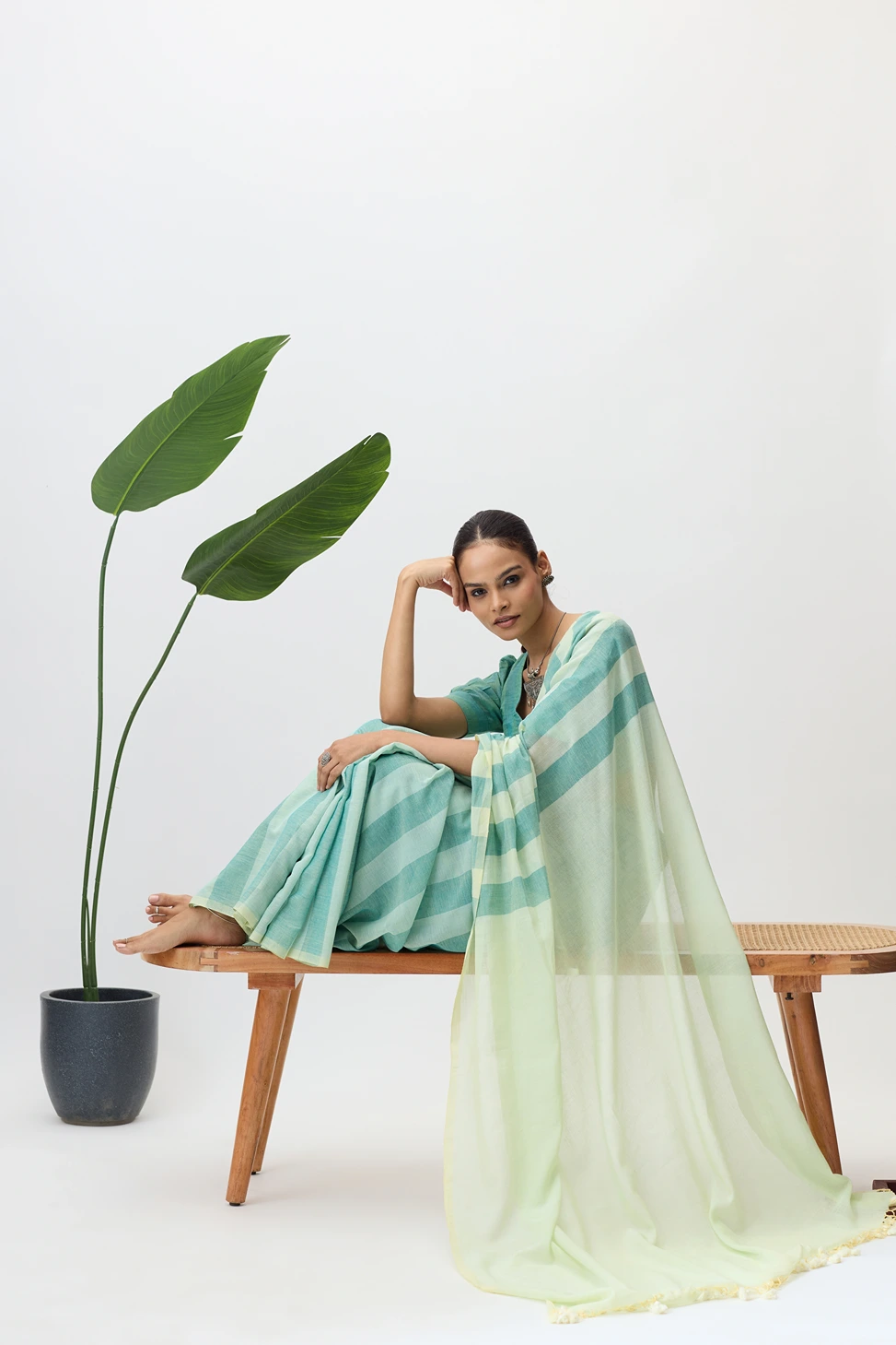 Vasantika is a pure cotton handwooven saree, featuring linear designs created on a handloom. The stripe pattern adds a touch of contemporary elegance while maintaining the breathable comfort and earthy charm of handspun fabric.