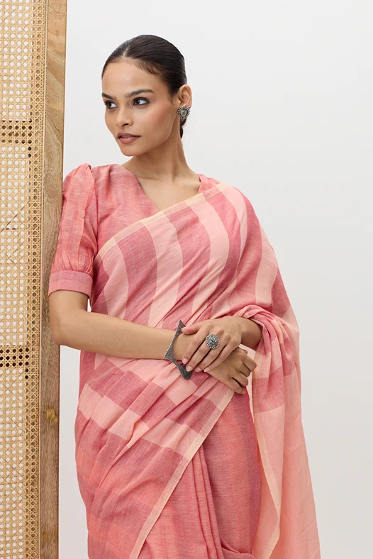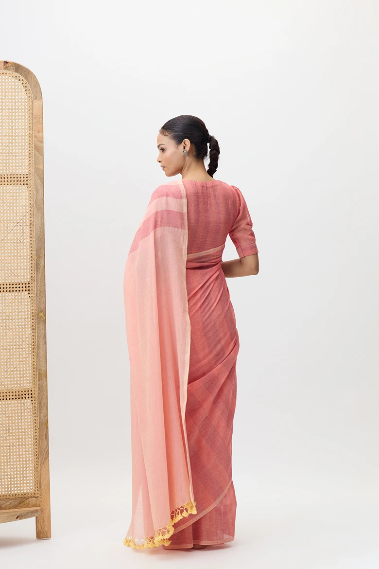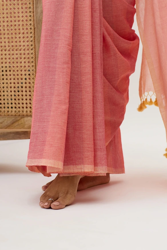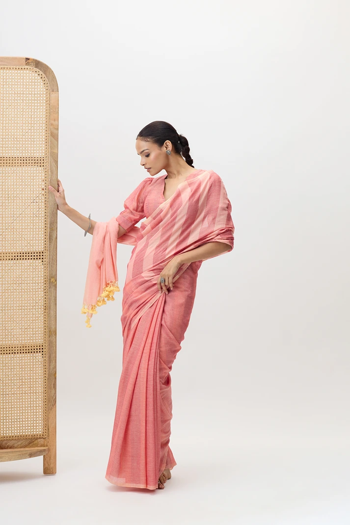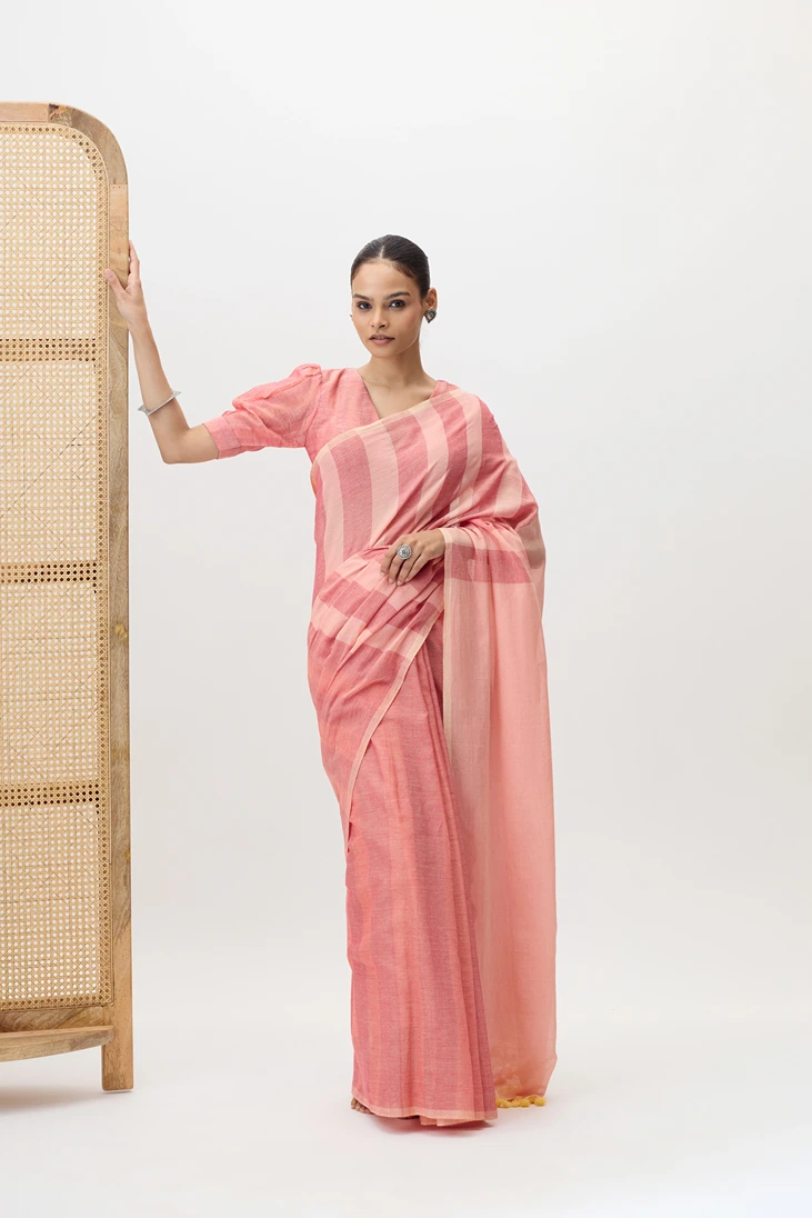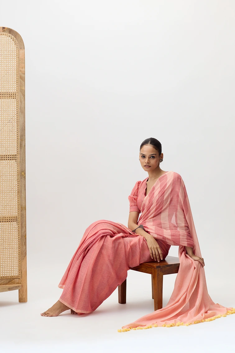 Vasantika is a pure cotton handwooven saree, featuring linear designs created on a handloom. The stripe pattern adds a touch of contemporary elegance while maintaining the breathable comfort and earthy charm of handspun fabric.